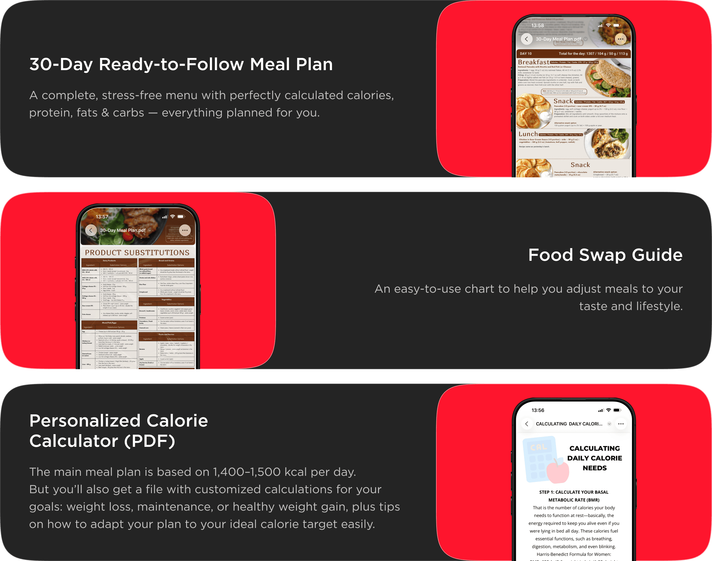 You’ll get a ready-to-follow weight loss meal plan for the entire month.