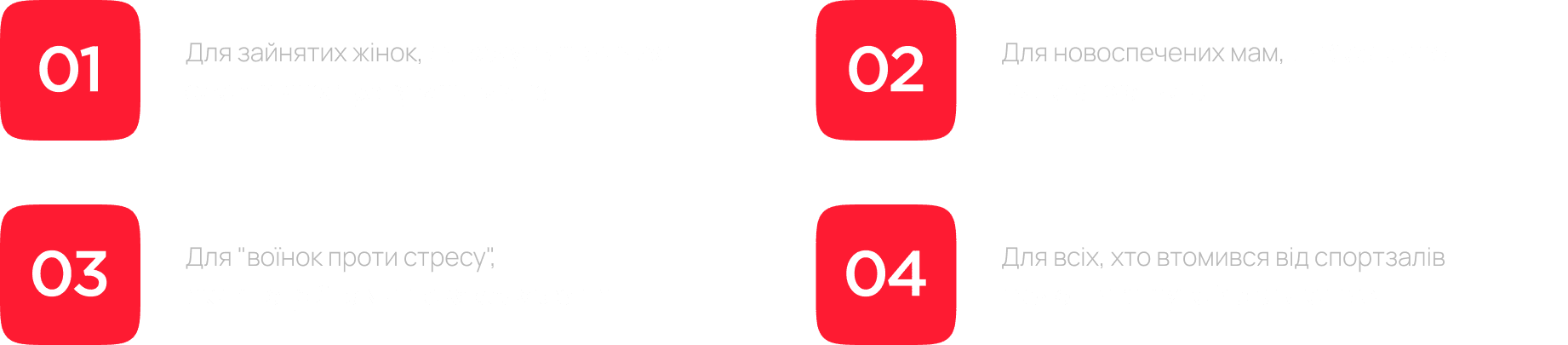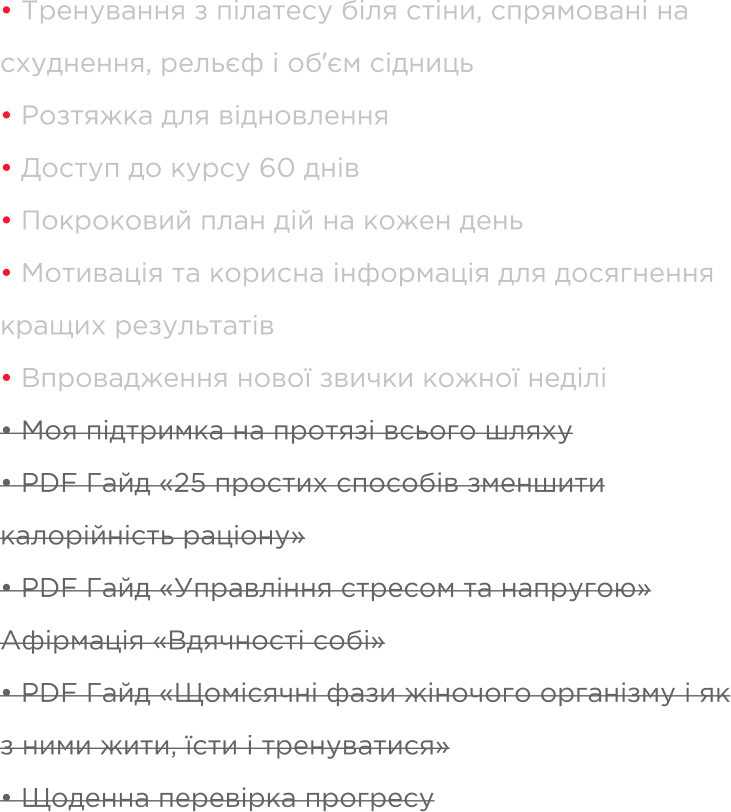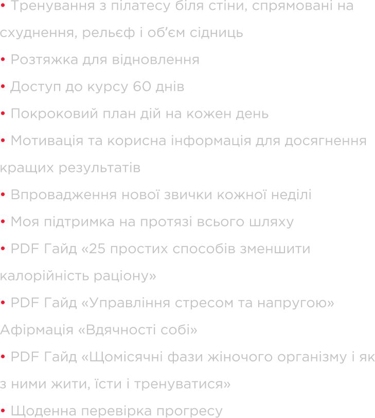 Тренування не потребують додаткової ваги і тренажерів, саме тому вони ідеально підходять для домашніх умов, Всі тренування у записі повноцінного формату. Ви можете виконувати їх у будь-який зручний для вас час! Тренування поділені на рівні, саме тому будуть комфортні для кожного рівня. Починати можна навіть з 15 хвилин тренування на день.